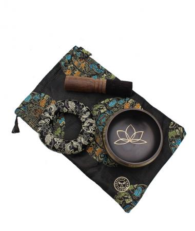 L'ensemble comprend un bol chantant, un maillet, un coussin annulaire et un étui de transport. Le coussin sert généralement à stabiliser le bol pendant son utilisation, tandis que l'étui permet de transporter et de ranger facilement le bol lorsqu'il n'est pas utilisé.