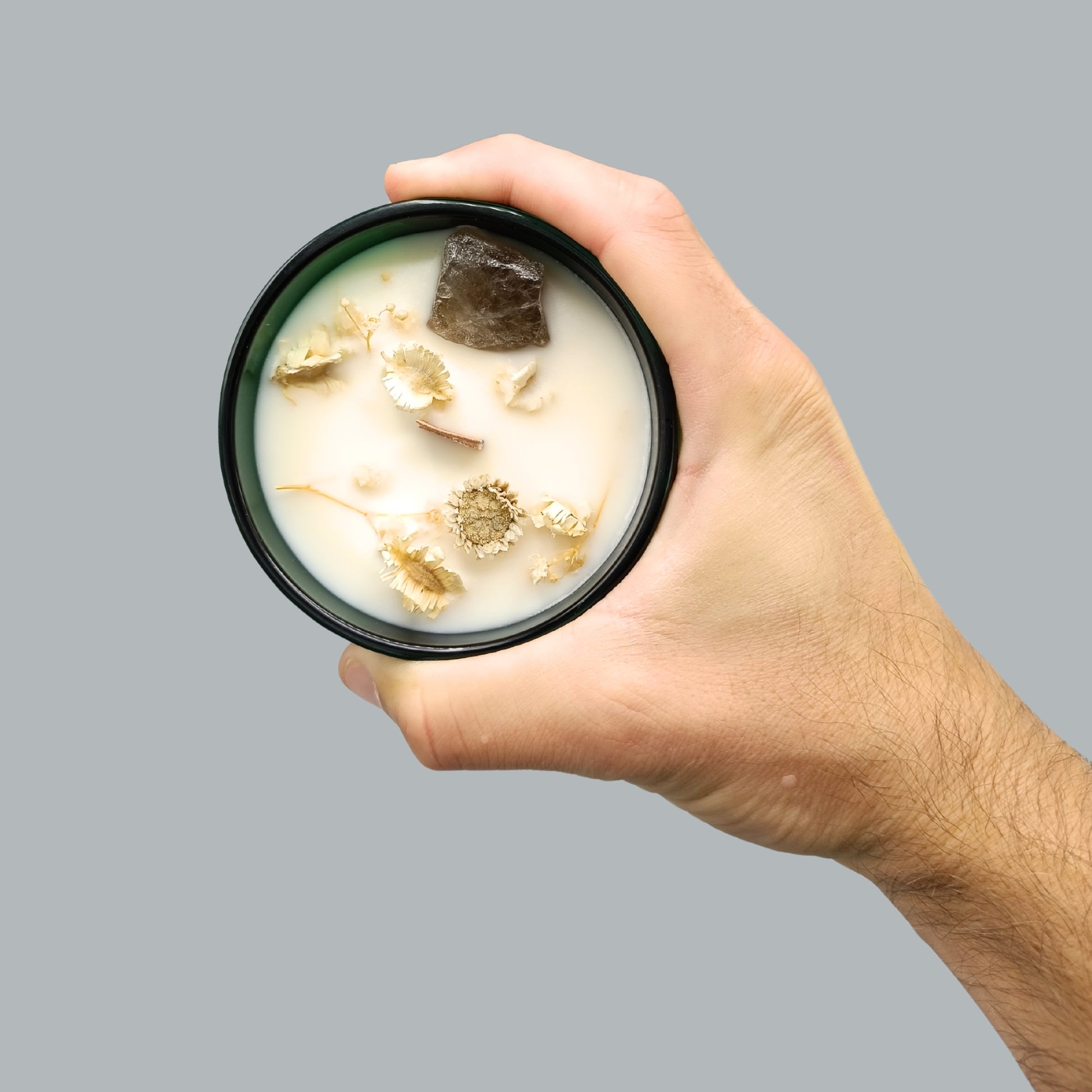 Découvrez la magie à l'intérieur en découvrant une pierre précieuse accompagnée de petits éclats de pierres précieuses, créant ainsi un spectacle éblouissant de merveilles naturelles. L'essence de ces bougies est encore rehaussée par les délicates fleurs sèches.
